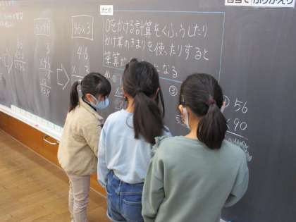 算数科の学習では、「かけ算の筆算」に取り組んでいます。写真は、練習問題に取り組み、自分の考えを黒板に書いている様子です。