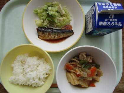 今日の献立は、ご飯、牛乳、いわしの土佐煮、野菜ソテー、豚肉とじゃがいものうま煮 です。