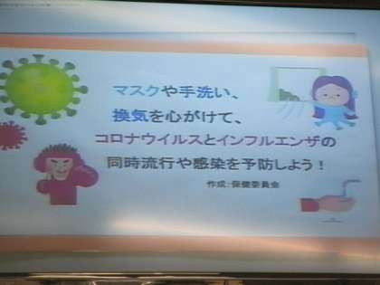 今日は、保健委員会から、感染症予防対策の徹底を呼びかける放送がありました。みんなで心がけていきましょう。