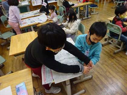 新聞紙を使って、どの新聞紙が一番広いかグループのみんなで比べ方を考えました。パッと見て分かるためには、はしをそろえることが大切ですね!長さくらべや水のかさの学習を生かして考える子供たちでした。