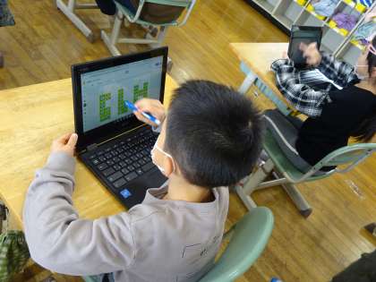 昨日は、「はしをそろえる」ことで広さが分かると学習しました。今日は、マスいくつ分で広さを比べると、数が多いほど広いことが分かりました。さらに、クロムブックで問題づくりを行うと、意欲的に作る姿が見られました。