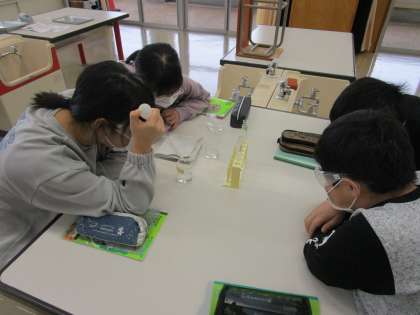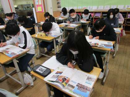写真は、社会科「新しい日本、平和な日本」と理科「水溶液の性質とはたらき」の学習の様子です。