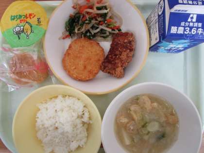 献立は、 ご飯、牛乳、ごま和え、みそ汁 と、