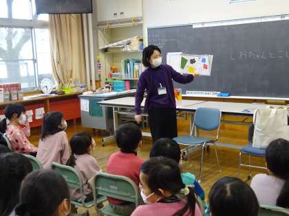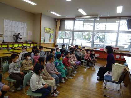 冬の季節にぴったりの本や昔のあそびについての本を紹介していただき、真剣にお話を聞きました。お話だけを聞いて想像を膨らませる読み聞かせもあり、目で見て耳で聞いて、楽しい時間を過ごしました。