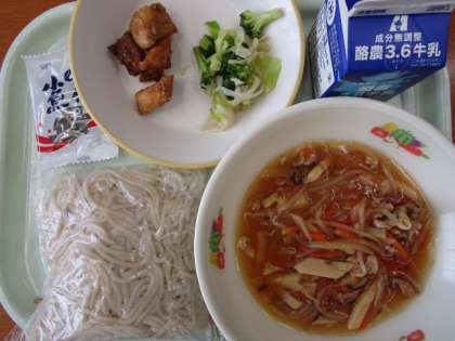 今日の献立は、ソフト麺の五目あんかけ、牛乳、ごまだれポテト、切り干し大根のドレッシング和え、味付け小魚 でした。