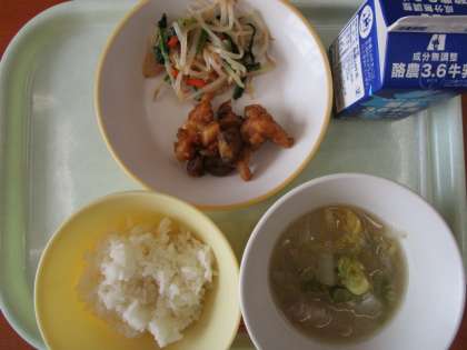 今日の献立は、ご飯、牛乳、鶏肉とレバーのカレー風味、小松菜のナムル、たら汁 です。