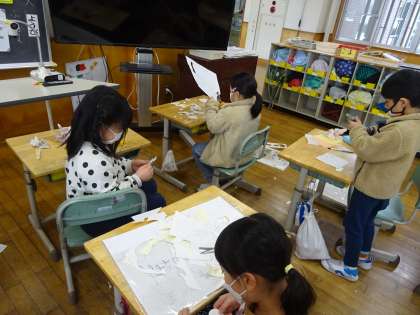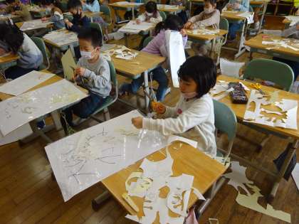 図画工作科では、ローラーシール版画を製作中です。今日は、版画に使うシールの部分を作りました。細かい部分もはさみを上手に使って切り、版画の完成を楽しみにしている子供たちでした。