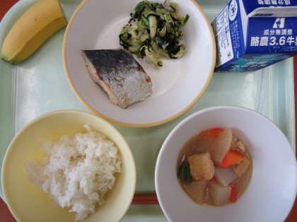 今日の献立は、ご飯、牛乳、鰆の塩焼き、磯和え、大根と厚揚げの中華煮、バナナ です。