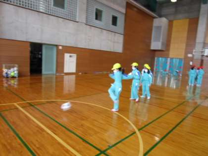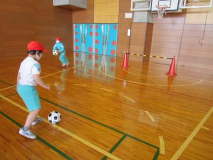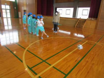 体育では、ボール蹴りゲームに向けて、足でボールを扱う練習をしています。今日はシュート練習をしました。どの蹴り方ならゴールに入るのか、離れたところから蹴っても入るのかなど蹴る強さを変えながら、ボールに慣えるように楽しみました。