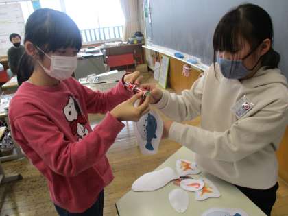 5年生の理科の学習では、どうしたら電磁石を強くすることができるのかについて乾電池の数を増やして流れる電流を強くしたり、導線の巻く数を増やしたりしていました。子供たちは、より大きな魚を釣り上げる方法を自分なりに考え、実践していました。