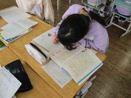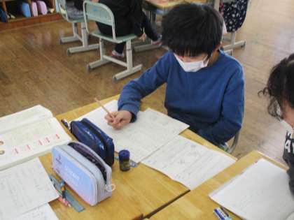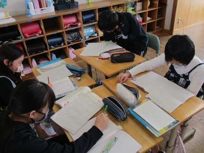 今日は書いた下書きを互いに読み合い、アドバイスをし合いました。どうすればよりよい紹介文になるかを考え、具体的にアドバイスする姿が見られました。