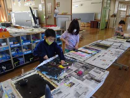 図画工作科で製作していたシール版画が完成に近付いています。ローラーの使い方で、細い線や曲がった線など、色々な表し方を楽しみながら、自分のイメージする季節に合わせて背景をつくりました。「剥がしたらどんなきれいな色になるのかな?」「完成がどんなものになるのかな?」などと、最後、シールを剥がすのがとても楽しみですね!