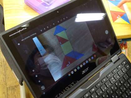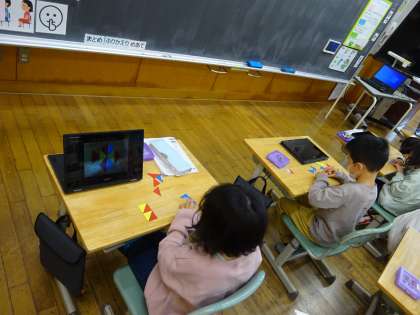 算数科では、かたちづくりの学習を進めています。三角の色板を使って、ヨットやロケット、家などを作りました。組み合わせ次第で、色々なかたちに変身することができました。できたかたちは、クロムブックで写真を撮り、みんなに紹介しました。
