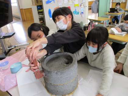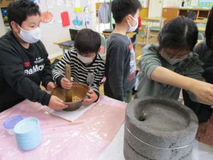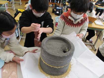 社会科で学習した昔の道具のひとつ「石臼」。実際に使ってみると、予想以上に力が必要でしたが、友達同士で協力して挽く子供の姿が見られました。