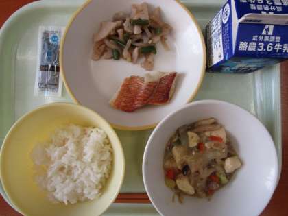 今日の献立は、ご飯、赤魚の塩焼き、れんこんのきんぴら、豆腐と野菜のうま煮、のり佃煮 です。