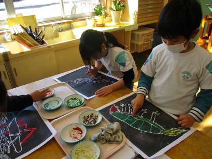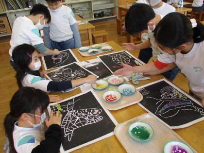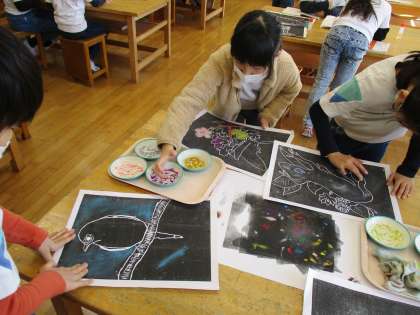 黒インクで刷った版画に、コンテを使って色をのせました。白黒の世界もすてきでしたが、色をのせていくと、生き物たちに命が吹き込まれたように感じられました。「きれいになった」「いい感じ」「〇〇さんのすごい」など、楽しみながら仕上げました。