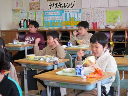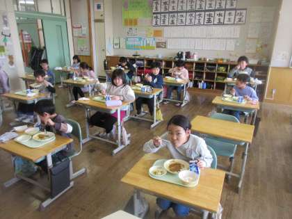 給食の時間には、声にしたい気持ちをぐっとこらえ満面の笑みでカレーを食べる姿が見られ、いつにも増して幸せな給食時間になりました。