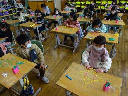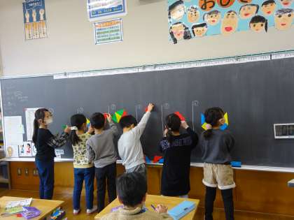 算数科では、かぞえぼうを使っていろいろなかたちをつくっています。お手本のかたちを見て、どこからつくればよいのか考えながら取り組みました。「三角をたくさんつくったらいい!」「四角を最初につくってから周りをつくるとやりやすい」などと、多くの発見がありました。