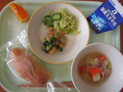 今日の献立は、米粉コッペパン、牛乳、えびとひよこ豆のオリーブオイル炒め、そえ野菜、ポテトスープ、清見オレンジ でした。