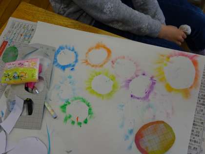 1年生最後の作品として、クレヨンを使ったぼかし絵を作っています。学習発表会でもクレヨンを題材にした劇を取り組んだことから、自分がした役の色を使ったり、好きな色を選んだりしていました。型紙をとってみると、きれいな形が浮かび上がり、「きれい!」と楽しみながら作っていました。