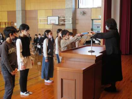 今日は修了式と離任式が行われました。修了式では、一人一人が一年間の頑張りを振り返りながらあゆみを受け取りました。「6年生になったらもっと頑張ろう」と意気込んでいる姿が印象的でした。