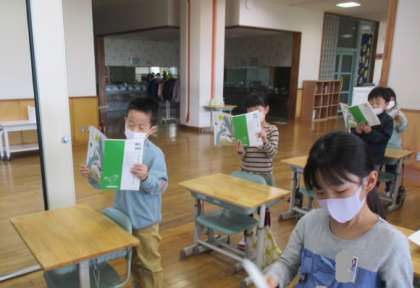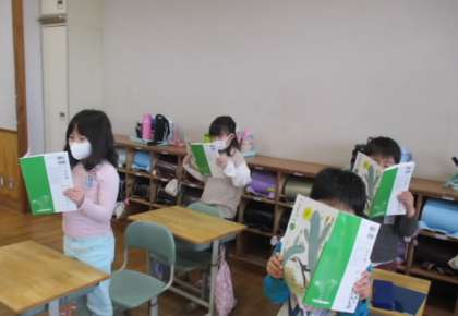 新しい教室に慣れて、今日は新しい国語の教科書を使って音読をしました。「たんぽぽ」という詩を元気よく音読し、暗唱に挑戦しました。何度も読んでいる内に覚えて、自信をもって読むことができました。また休み時間には外で遊んだり、桜の下で写真を撮ったりしました。