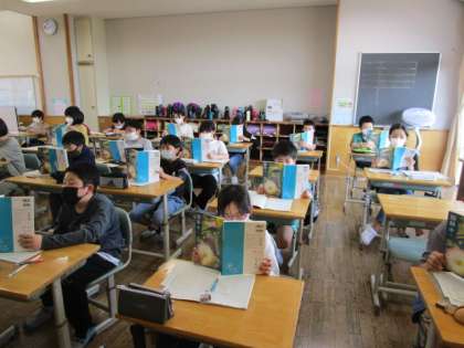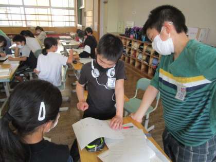 国語科の学習では、「かんがえるのっておもしろい」の詩を読んで、感じたことや考えたことをワークシートに書いたり、友達に伝えたりしました。第一連と二連を比べてみると、文字数が同じことで言いやすいリズムになっていることが分かり、詩の面白さに気付くことができました。