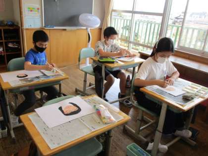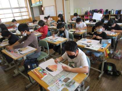 図画工作科では、5年生として頑張りたい姿を想像しながら、自分の顔を描いています。真剣な顔、笑っている顔、集中している顔など、色々な表情があります。全員の顔が仕上がり、集合したときには、5年生として目指したい姿が見えてくるような気がしています!楽しみです!