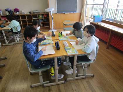 友達と協力してそれぞれ一文ずつ考え、組み合わせて一つの物語を作りました。子供たちは自分の前に話す友達の文をよく聞き、楽しくお話を続ける事ができました。
