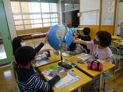 社会科の学習では、地球儀を使い、世界の国々ついて気付いたことや発見したことをたくさん見付けました。「ロシアは大きい国だな!」「この海は何て名前だろう?」などと、一人一人が真剣に考えていました。みんなの疑問を一つ一つ解決していきましょう!