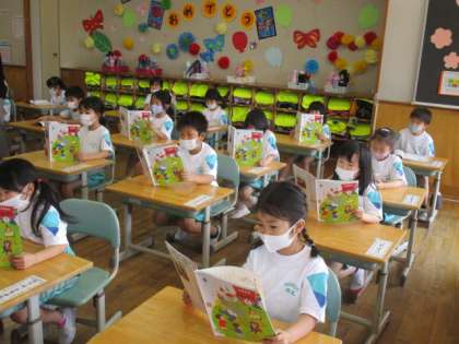 音楽は、音楽専科の先生と学習します。先生の自己紹介をしっかりと聞いたり、自分たちの好きなものについて紹介したりしました。また、今日は、たくさんの童謡を聞きました。知っている歌が聞こえてきたときには、一緒に口ずさんでいました。
