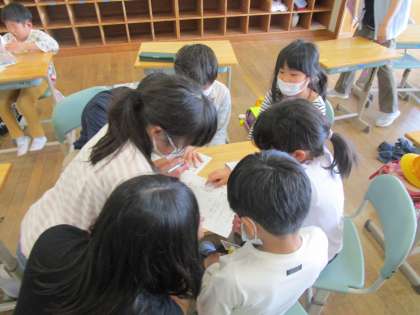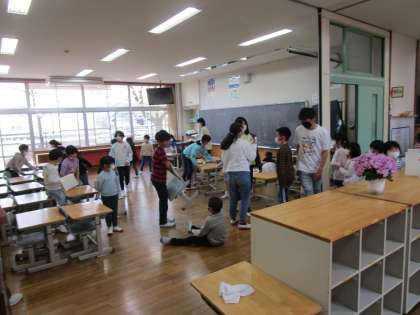 6年生は1年生にランドセルや体操服の片付け方、掃除の仕方を教えたり、読み聞かせなどを行いました。一生懸命に片付けをしようとする1年生に優しく声をかけながら、教えていました。