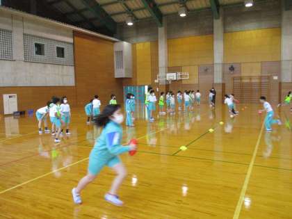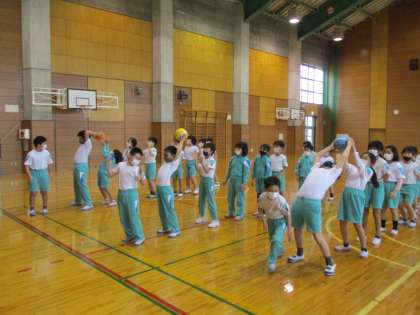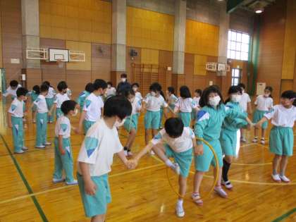 アリーナでの体育ではチームに分かれてフラフープ回しやリレーを行いました。「ここからフラフープを通すといいよ」とアドバイスし合ったり、「アンカーは誰にしよう」などと作戦を立てたりしながらチームで協力して運動を楽しんでいました。