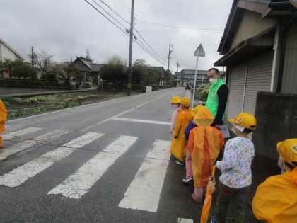 子ども達は自分の目で車が来ないか確かめてから、道路の横断や右側通行をしていました。帰ってきてからは振り返りを行い、交通ルールを守って安全に歩くように気持ちを新たにしました。
