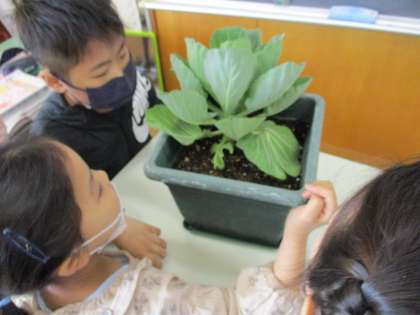 理科の学習で、春見つけにグラウンドへ行くと、「先生、かえるおったよ!」「ダンゴムシもおる!」と嬉しそうに見せてくれました。また、キャベツの苗には、小さい小さいモンシロチョウのたまごがいくつもあり、子供たちは目をキラキラさせて数を数えていました。春の生き物大発見!これからの学習も楽しみですね。