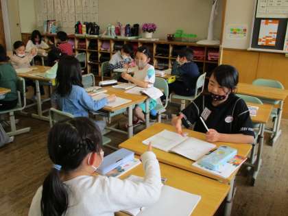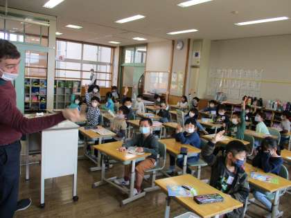 外国語の学習は、世界の国々の国旗やあいさつの学習を行っています。「この国旗は?」と尋ねられると、たくさんの挙手!!たくさんの子供たちが、国の名前を覚えていました。