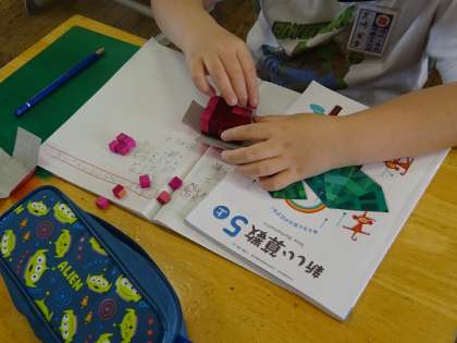 算数科では、立体のかさの学習に取り組んでいます。展開図だけでは、かさの大きさが比べることができなかったので、もとにする大きさを決めて、それが何個分あるかで大きさを比べることにしました。展開図を組み立てて、その中に1立方センチメートルの立方体を敷き詰めると、どちらが大きいかさかはっきりと分かりました。さらに、敷き詰める中で、「これ計算でできそうだな?」との声も聞こえてきました。簡単に求めることができる方法をこれから考えていきましょう!