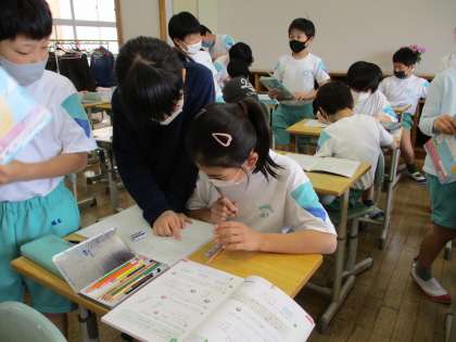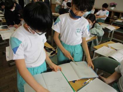 算数科では、途中で「お算歩タイム」と称し、友達と考えを交流したり、問題の答えを確認したりする時間をつくっています。今日は、大きい数の筆算の工夫の仕方について友達と交流し、「0が1つ抜けていることに気がついた」「たくさんの友達と同じ考えで自信をもてた」など、前向きな感想をもつことができました。