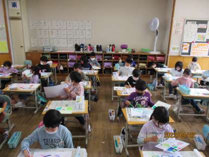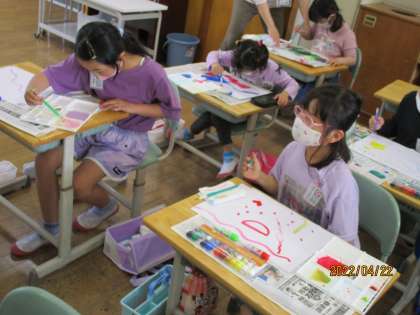図画工作科では、いろんな色でそれぞれが想い想いの線を描きました。始めはおそるおそる線を描いていましたが、最後には気持ちよさそうに様々な線を描いていました。仕上がりが楽しみですね。