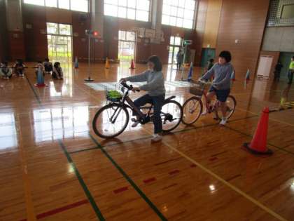 見通しの悪い交差点や踏切の安全な横断の仕方を聞いたり、実際に自転車に乗って後方確認する大切さを学んだりしました。また日頃から自転車を点検する大切さも学びました。自転車に楽しく安全に乗るために、今日学んだことを生かしていきましょう。