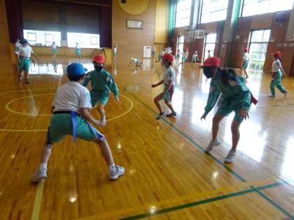 体育科では、リレーの学習を進めています。しかし今日は、雨が降っていたため、体育館での活動となり、しっぽ取りゲームをしました。追いかけられたときの動きがリレーのバトンパスでの動きと似ており、子供たちは、全速力で走っていました。晴れたときには、外で思いっきりできるといいですね!
