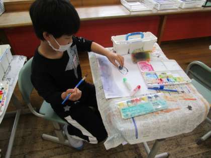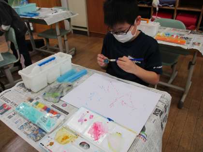 絵の具をつけたビー玉を転がして歪な線をつくったり、ブラシやスポンジでこすって絵の具をかすれさせたりして、筆だけでは難しい表現を凝らして制作していました。子供達は、きれいに仕上がった作品を眺め、満足そうにしていました。