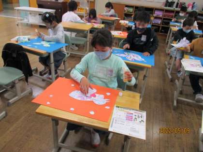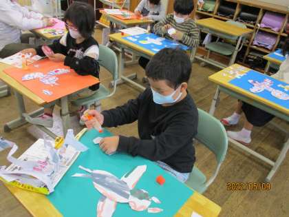 楽しかったGWも終わり、楽しい思い出をたくさん話してくれた子供たち。今日の図工は、前時に模様を描いた紙を切り、鳥の形を製作しました。「どんな向きにしようかな?どんな模様にしようかな?」と、考えながらカラフルな鳥が完成しました。