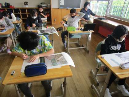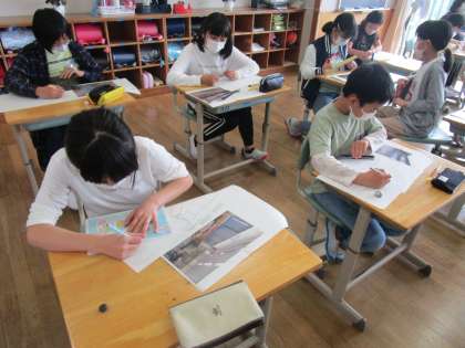今まで過ごした思い出の保内小学校を絵として残すために、下書きに一生懸命に取り組みました。遠近法を利用して、立体的な絵にしようと工夫していました。絵の完成がとても楽しみです。