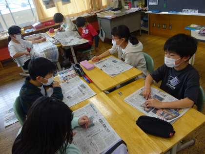 国語科では、和語・漢語・外来語の学習を進めています。和語は、やさしい感じがする!漢語は、かたい感じがする!外来語は、外国から来た言葉かな?などと、言葉のもつ雰囲気を感じながら取り組みました。新聞紙の中にもたくさんの和語・漢語・外来語があり、グループのみんなで多くの言葉を探すことができました。