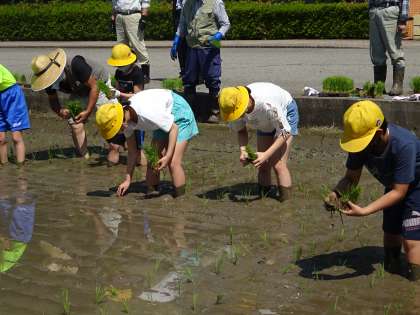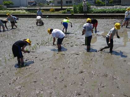 今日は、ファーム高善寺の皆さんや地域の方と一緒に田植え体験を行いました。田んぼに入るときに、「うわー!ぬるぬるする!」「足が抜けない!」「植えるの大変だ!」などと、田植えの大変さを実感しながら子供たちは取り組んでいました。特に同じ姿勢でずっと植え続けることに大変さを感じたようです。昔の人たちは、こんな思いをしながらお米を育てていたことに気が付き、お米をいただくときには、より一層感謝しながら食べたいですね!これから、どのように大きくなっていくのか、秋の収穫まで楽しみですね!