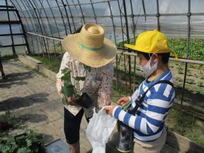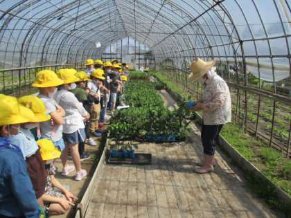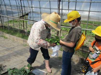 野菜の苗を買いに長岡さんのビニールハウスへ行きました。長岡さんから苗の植え方を教わり、その後一人ずつ野菜の苗を自分でお金を出して買いました。野菜によって葉の形や色の違いなどに気付き、自分の野菜を大切に持って帰ってきました。