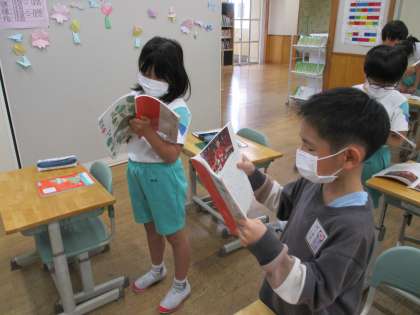 国語科の時間を中心に音読の経験を積み重ねています。交互読みや竹の子読みなど、友達と楽しみながら読む工夫をすることで、すらすらと読めるようになってきました。