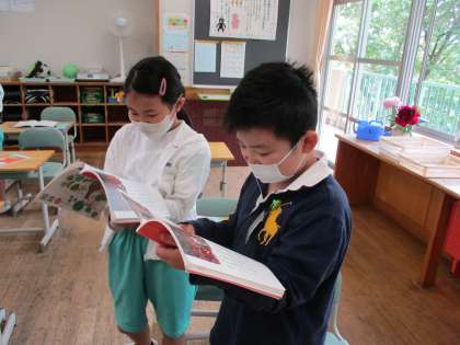 国語科の時間を中心に音読の経験を積み重ねています。交互読みや竹の子読みなど、友達と楽しみながら読む工夫をすることで、すらすらと読めるようになってきました。