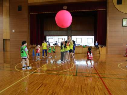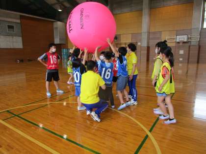チームでかけ声をかけながら、みんなで大きなボールを支えたり、投げたりして楽しく参加する子供たちの姿がみられました。